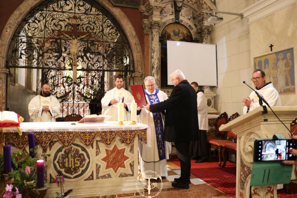 Na kraju euharistije nadbiskup Mate je prema tradiciji kustodu fra Francescu darovao repliku ikone Majke Milosti, a kustod je darovao dvoje male jaslice iz Nazareta, što je jako simboličan poklon koji povezuje naša dva mjesta.